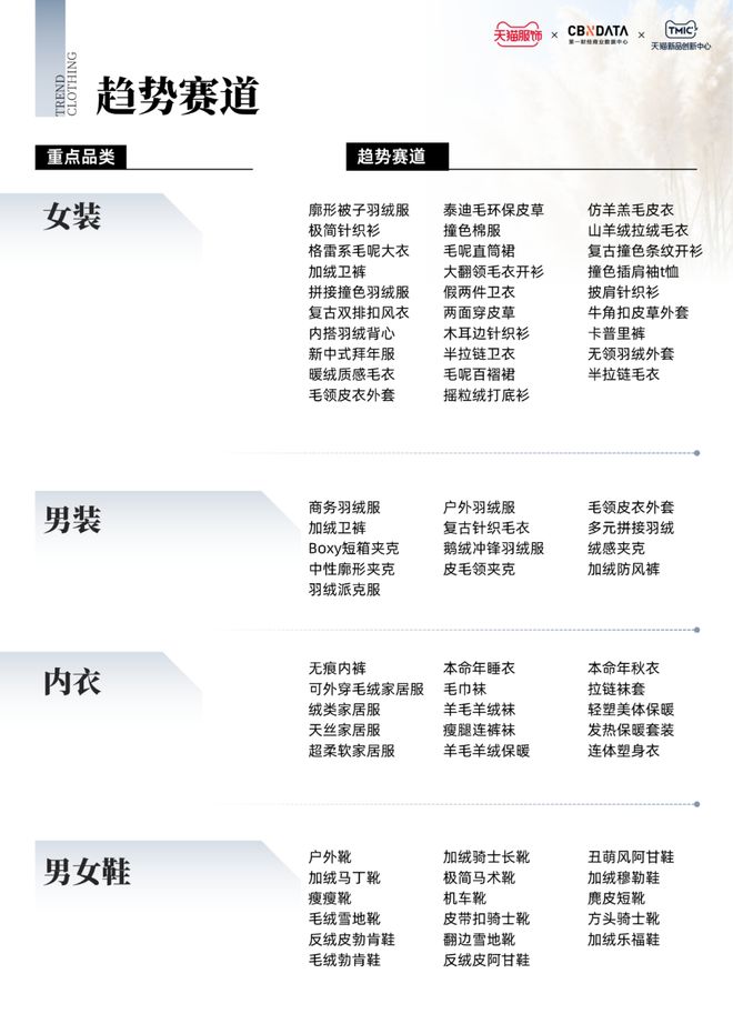 季节更迭带来的叠穿需求与情绪导向的消费态度,让冬季外套、休闲裤装、冬季内搭、潮流皮靴成为本月值得关注的趋势品类。品牌亟需精准捕捉消费趋势,围绕极简廓形大衣、绒感外套、羊毛阔腿裤、蕾丝打底衫、皮带扣骑士靴等核心单品,组建具有风格一致性与场景适配性的产品矩阵。