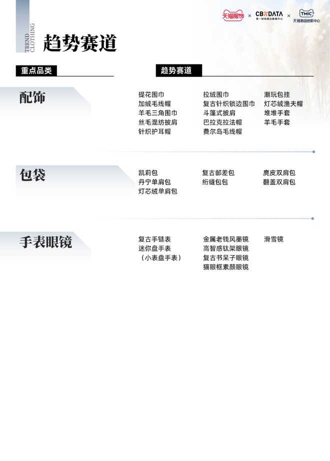 气场十足的极简廓形大衣、舒适百搭的白色毛线裤、精致轻暖的蕾丝打底衫、复古显瘦的西部堆堆靴......这些趋势单品勾勒出11月服饰趋势热点。除了对于上述四大重点趋势品类的解析,《报告》还基于社交媒体热度、市场消费规模以及供需状况,聚焦女装、男装、内衣、箱包配饰等品类,围绕细分趋势赛道挖掘潜力单品,提供服饰消费的前瞻性动态。