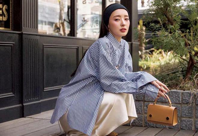 选用与发色相近的亚光质地发带,为条纹衬衫×柔美半身裙的混搭做视觉留白,将冲突单品完美调和。
